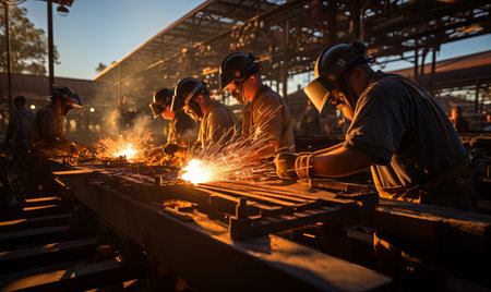 Group of men working together to weld a large metal structure, sparks flying as they carefully craft the piece.