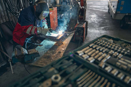 Focused photo on welder wearing uniform and sitting at his workplace, connecting details
