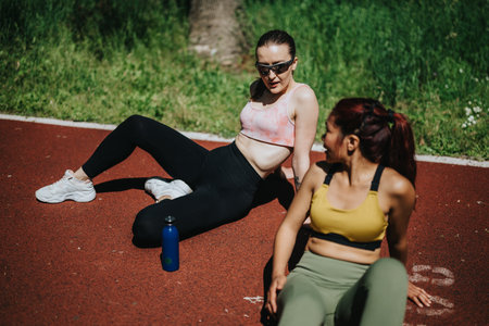 Two friends enjoying a break and laughing together during a workout session in a gym