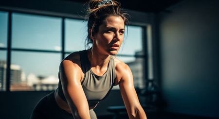 Focused woman training with dumbbells for strength and fitness in the gym Generative AI