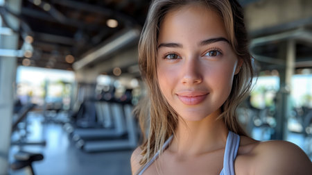 A beautiful young woman takes a selfie in a gym, showing her radiant smile and natural beauty. The fitness center in the background indicates she just finished a workout.
