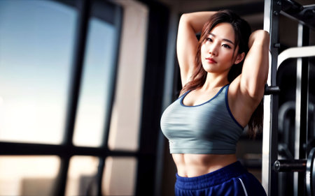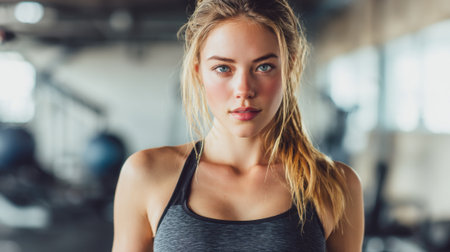 Confident young woman wearing a sport tank top standing alone in a gym after a workout session. Generative AI.