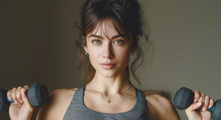 Focused woman training with dumbbells for strength and fitness in the gym Generative AI
