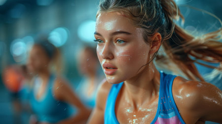 A young woman stands in a gym showing her determination and confidence. She has long hair and is dressed in workout gear ready to start her fitness routine.