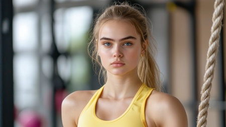 A young woman with a confident expression poses in yellow sportswear at a gym, showcasing determination and strength in her fitness journey. Perfect for wellness themes.