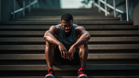 Portrait of goodlooking young African athlete wearing stylish shades and black outfit looking happy and cheerful sitting on sidewalks at sea waiting for his friend to joi : Generative AI