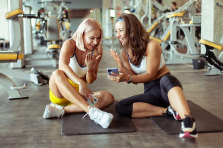 Happy two spoty girl talking together after working out training in gym.