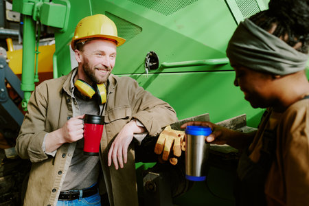 Bearded Caucasian man and his Black female colleague enjoying conversation during coffee break at work in factory