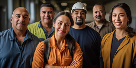Factory workers standing in a row showing teamwork and unity. Labor and job concept.