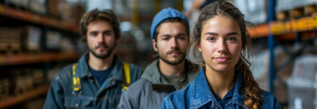 Workers stand of different nationalities in clean clothes stands against the backdrop of an industrial warehouse. Realistic photography
