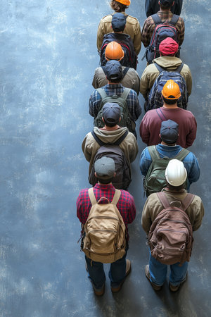 Line of diverse workers in safety gear and backpacks, ready for the job.