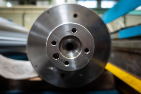 Part of lathe in workshop is close-up. Old lathe for metal processing stands in factory premises. Industrial background.