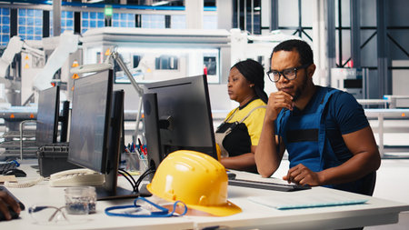Inspector in solar panel factory review manufacturing equipment and production process, checking documentation files. Black man at facility ensuring eco friendly photovoltaics. Camera B.