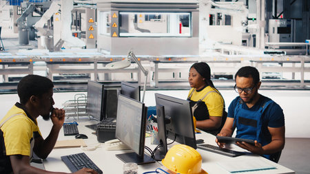 Solar energy expert updates design models in eco friendly factory with a focus on research and innovation. Male worker supports sustainable industrial growth using digital systems. Camera B.