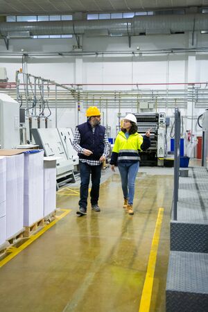 Full length of foreman and inspector discussing equipment in workshop. Man and woman in hardhats and uniform walking on plant floor. Labor or occupation concept