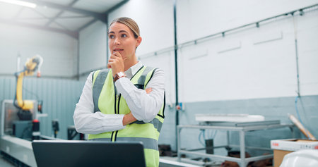 Engineer, planning and woman in factory for robotics, manufacturing and problem solving. Thinking, automation and worker with idea for production, industry 4.0 or insight for innovation on laptop