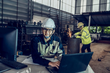 Heavy industrial worker is working on metal work factory, Machine for steel structure industry concept
