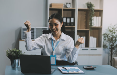 Thrilled young woman raising her arms and shouting with happiness while sitting at her desk in a call center. Sales representative winning a big sale deal
