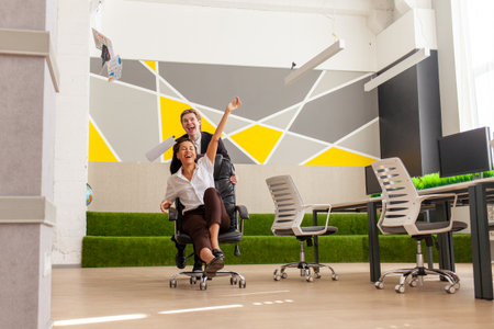 Couple of excited joyful young colleagues riding office chair in workspace, playing active game on work break, laughing. Manager man pushing armchair with happy coworker woman, smiling, laughing