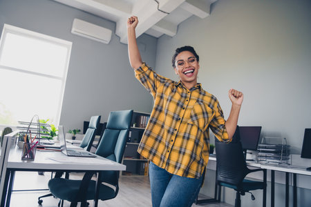 Photo of lovely young lady raise fists winning dance dressed yellow plaid shirt comfortable startup office loft room interior