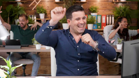 Happy smiling businessman feel happy work complete Teamwork success at work in the office concept