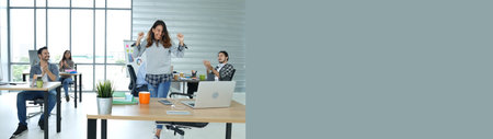 Successful handsome smart Asian creative businessman and his colleagues arms raised celebrating success Operating Result feeling happy in office. Lifestyle business man in his workplace concept.