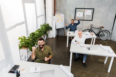 high angle view of happy handsome businessmen showing yes gesture in office