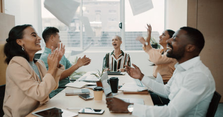 Happy, business people or applause with documents in air for completion, done or finished in office. Excited, group or employees clapping in celebration with paperwork for project success together
