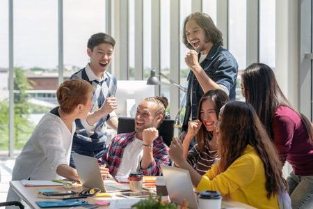 Group Of Asian and Multiethnic Business people with casual suit working with happy action and celebrate when project is completed in the modern workplace, people business group concept