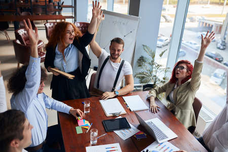 Colleagues celebrate the successful start of a business project in the office