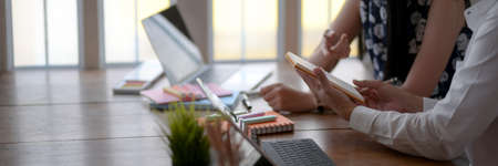 Closeup graphic designer team working together with computer laptop and tablet at the wooden working desk over comfortable sitting room as background.