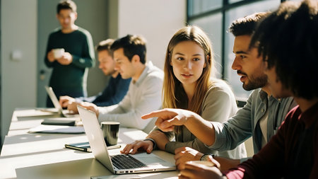 A team leader guides a group of people sitting around a table, each focused on their laptops, A determined leader leading a team meeting with enthusiasm and authority