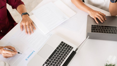 Office workers writing notes, using laptop at table with cups of coffee. Closeup of hands, cropped shot. Education or digital communication concept