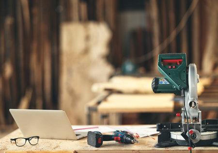 Modern laptop and papers placed near electric carpenter tools on workbench in joinery workshop