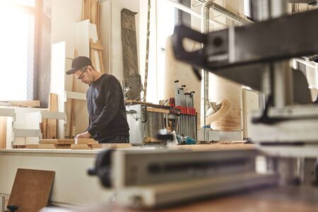 DIY woodworking and furniture making and craftsmanship and handwork concept. Carpenter working on woodworking machines in carpentry shop. Young man working as carpenter and taking wood stock.