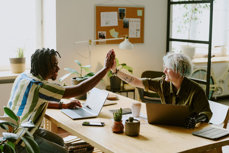 Successful gen Z Black man and Caucasian woman with disability doing high five after finishing work on code in modern office