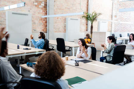 Happy multiracial coworkers sit in the office clapping together celebrating good business news.