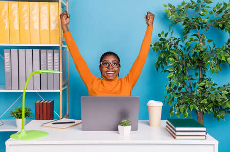 Portrait of satisfied young lady at work. Happy excited black business woman standing by office desk with laptop computer, looking at camera, smiling and giving thumbs up with both hands