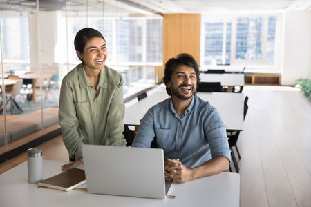 Candid moment in creativity. Laughing teammates colleagues young woman mid aged man collaborate develop project in modern coworking having fun together looking aside from notebook feel joy enjoy work