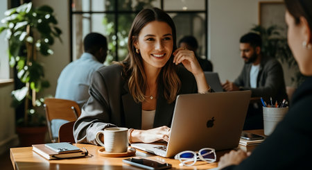 A smiling businesswoman sits at a wooden table with a laptop, coffee cup, and glasses, surrounded by colleagues in a modern office space with plants and large windows.