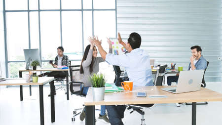 Business team working at the office and celebrate corporate success deal, Positive emotions business people concept
