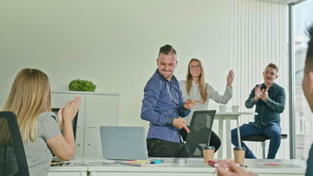 A friendly atmosphere in the office. Young, confident employees of the multiracial team discuss tasks and laugh at the morning meeting