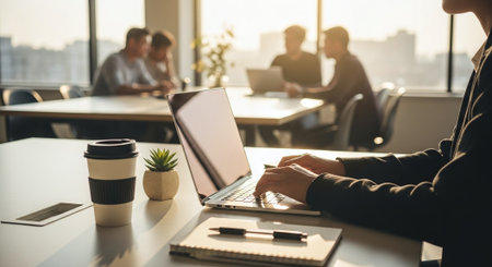 A person typing on a laptop in a modern office setting, with a coffee cup and a small plant on the table, blurred colleagues in the background