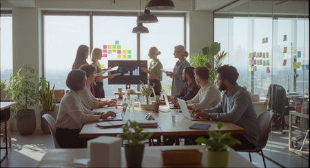 A modern office meeting with diverse professionals discussing ideas, laptops on the table, large windows with city view, plants in the background