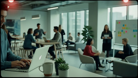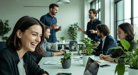 A modern office space with people collaborating, working on laptops, and discussing ideas, surrounded by plants and large windows
