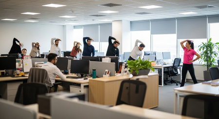 In a bright office, employees stretch at desks during a break, promoting wellness and productivity. The scene highlights a modern, health-conscious workplace culture.