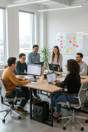 A group of professionals works in a bright, contemporary office setting. Natural sunlight illuminates the scene, highlighting the modern decor and diverse team engaged in various tasks. The composition features individuals at desks and collaborating, suggesting a collaborative and productive atmosphere. Suitable for commercial or editorial applications related to business.