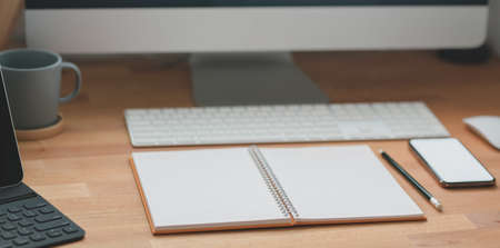 Cropped shot of modern workplace with open blank notebook, keyboard computer and desktop computer with office supplies