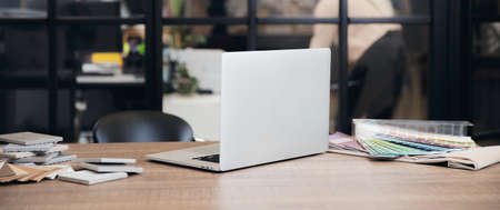 Banner Interior designer workplace. laptop, tile sets and colored set of fabrics for furniture