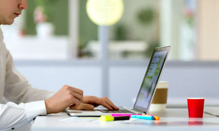 Business person in white shirt working on computer at office with color stationery pens and markers coffee mug on desk
